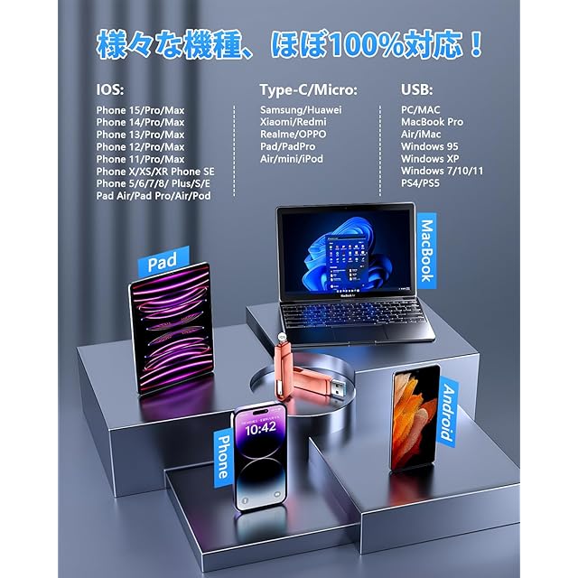 【4in1・多機能usbメモリー】USBメモリはiOS、Type-C、USB、Micro USBの四つのコネクタを搭載し、Phone、iPad、パソコンからテレビやプリンターまで、ほとんどの機種と互換性があります。アプリ不要のUSBメモリをご利用いただき、スマホの容量不足を解消できて、写真保存・データ保存の機能も果たすことができて、データ移行、データ管理、ファイル移動、データ共有やファイル圧縮などの機能も搭載されます。