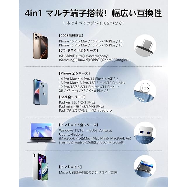 【4in1 ポート搭載|ios/Type-C/USB/Micro USB 対応の互換性抜群 USB メモリ】 ios端子・Type-C・USB-A・Micro USB の 4 つのポートを搭載し、Phone/Android/PC/Mac/pad などあらゆるデバイスと直接接続可能。1 つの USB メモリで iOS/Android/Windows/Mac OS 間でデータを共有・移行!詳細対応機種:Phone 全世代(16/15/14/13/12/11/X/8/7 シリーズ含む)、pad Pro/Air/mini/ ベーシックモデル、MacBook(Pro/Air)、Type-C スマホ / タブレットなど多数対応。