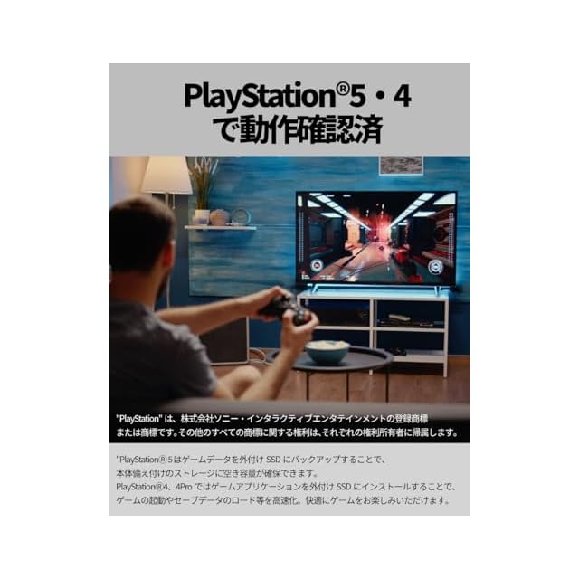 ✅【PlayStation 5、PlayStation 4に使えます】 PlayStation 5、4、4Proでの動作確認をしています。 PlayStation 5 はゲームデータを外付けSSDにバックアップすることで、本体備え付けのストレージに空き容量が確保できます。 PlayStation 4、4Proではゲームアプリケーションを外付けSSDにインストールすることで、ゲームの起動やセーブデータのロード等を高速化。快適にゲームをお楽しみいただけます。