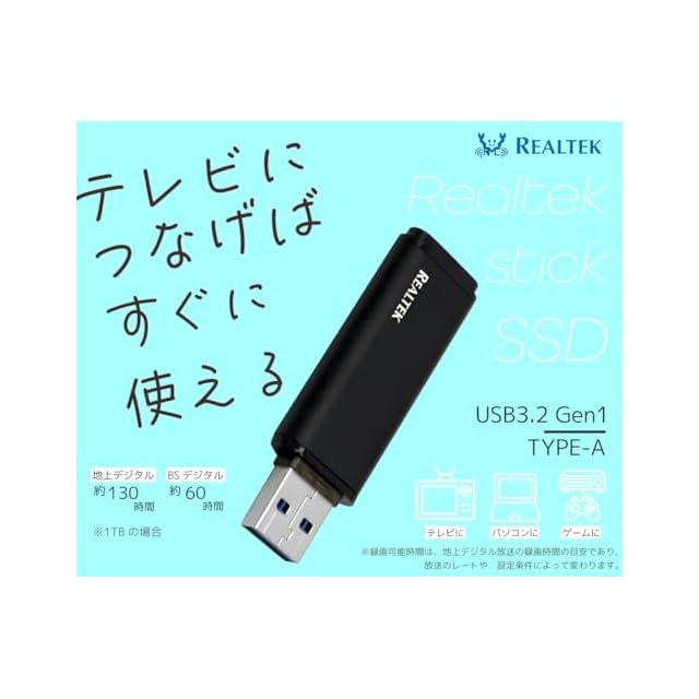 リアルテック SSD 外付け 1.0TB スティック型 読込最大 450MB/秒 PS5/PS4対応(メーカー動作確認済) USB3.2Gen1 Type-A ブラック Realtek CFD RTKPD-1000U3A/GR TB