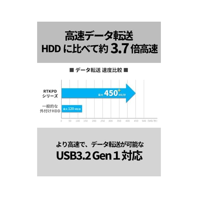 ✅【高速データ転送】 USB3.2 Gen1に対応しており、データの読込性能は最大 450MB/秒。データの書込性能は最大400MB/秒と従来の外付けHDDと比べて高速な転送を実現。 大容量の動画データや画像/写真データの保存やバックアップも快適です。 (USB3.2(Gen1)でデータを転送するには、PC側がUSB3.2(gen1)に対応している必要があります)