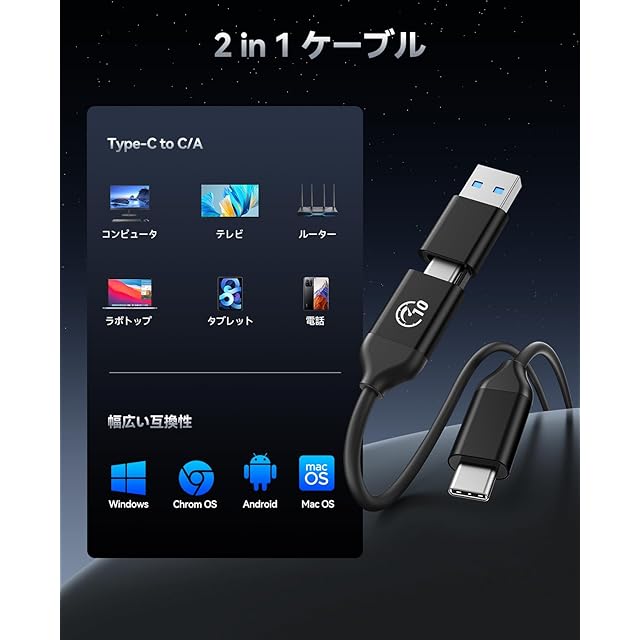 2 in 1 USB C & Aケーブル: USB-CおよびUSB-Aデバイス(スマートフォン、PC、ノートパソコン、タブレットなど)に対応します。様々なシステム(Android、IOS、macOS、Windows)にプラグアンドプレイで対応。