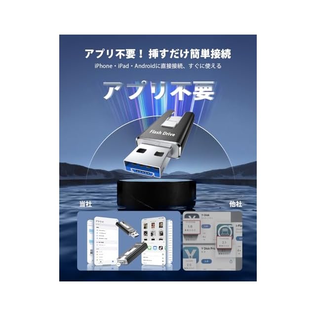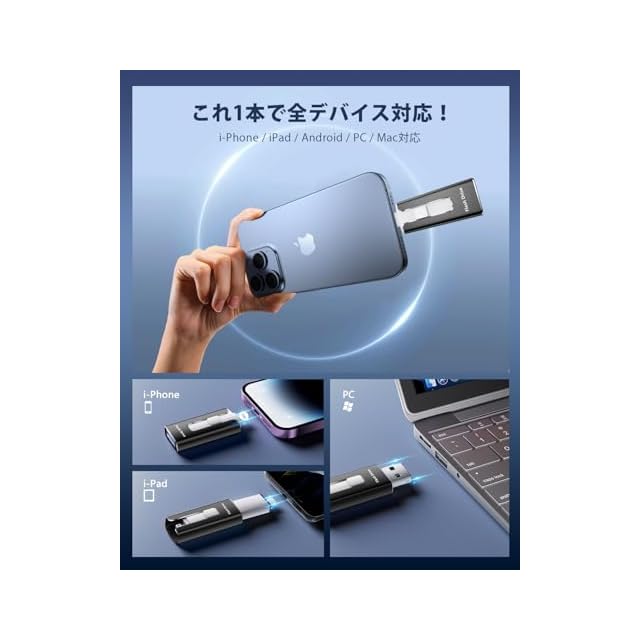 【アプリ不要!Phoneから直接usbメモリに写真保存できる神アイテム】このPhone対応usbメモリは、専用アプリ不要で、PhoneやiPad、Androidスマホ、Windows PC、Macに直接接続できるため、複雑な設定やネット環境がなくてもPhoneの写真や動画を即座に保存できます。操作も「接続→選択→保存」の簡単3ステップで、機械に不慣れな方でも使いやすいです。Phoneてテータ保存usbとして、iCloudに頼らずに旅先や日常の思い出をスマートにバックアップできる便利なスマホusbメモリです。