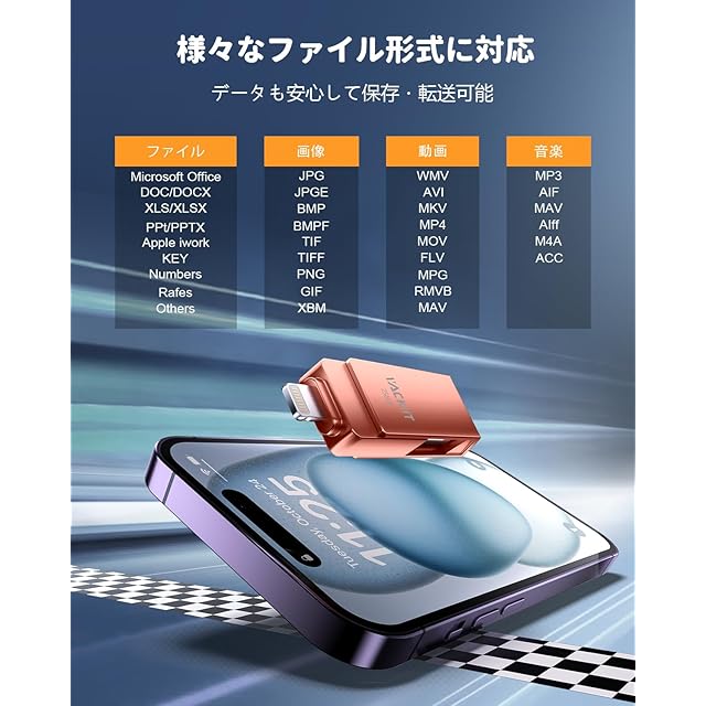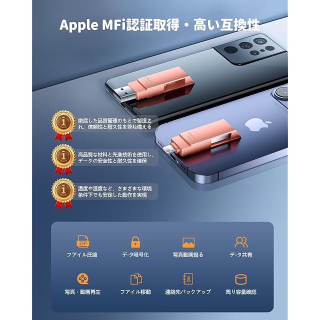 ✔【Apple MFi認証取得・高い互換性】iPhone 用USBメモリでは、アップルが設けた認証プログラム Apple MFi が認定されております。これアイフォン バックアップはアップルより提供されたライトニングコネクタを使って、アップルのサポートを受けて作成された周辺機器です。なので、すべてのiPhoneおよびiPadシリーズと互換性があります。iPhone 14 /14 Pro/13 Pro Max/13 mini/ 12 /12 Pro/12 Pro Max/12 mini/ 11 /11 Pro/11 Pro Max / SE/X /XS/XS Max /XR/8 Plus/8 / 7 Plus/7 /6s Plus/6s/6 6 Plus /iPad Air iPad(第9/8/7/6/5世代)iPad mini(第6/5/4/3世代)10.5インチiPad Pro 9.7インチiPad Pro / iPod touch 6/7/ MacBook Air/Macbook Pro/ iMac/PC /ノートパソコンなどのデバイスに対応します。
