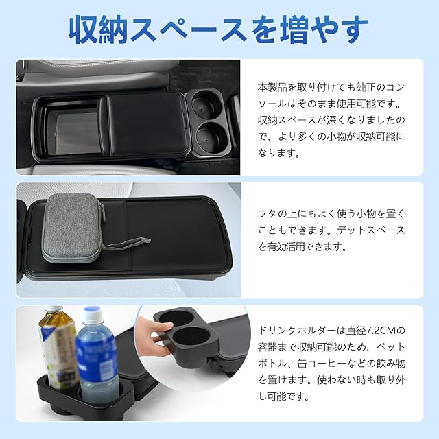 【豊富な収納機能】1、ドリンクホルダー付き、ドリンクホルダーは直径7.2CMの容器まで収納可能のため、ペットボトル、缶コーヒーなどの飲み物を置けます。2、小物入れ:手軽にスマホを置くこともできます。名刺、カードなども置けます。