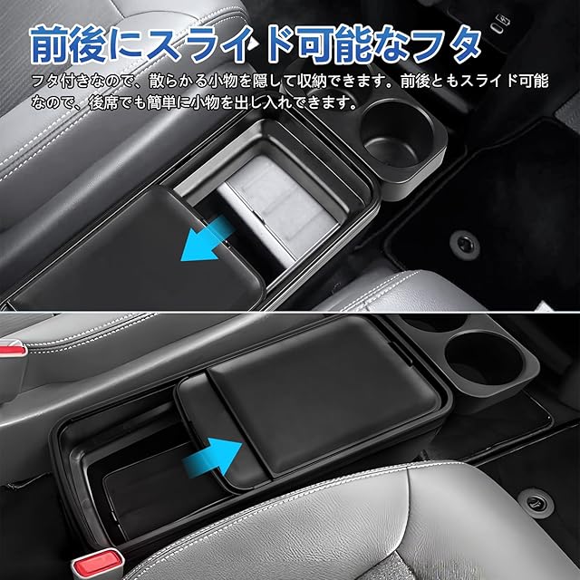 【便利なスライドできるフタ】純正でついているコンソールボックスに、ゴミも入らず上にバック等の物もおけるので、散らかりがちな車内をスッキリ整頓できます。