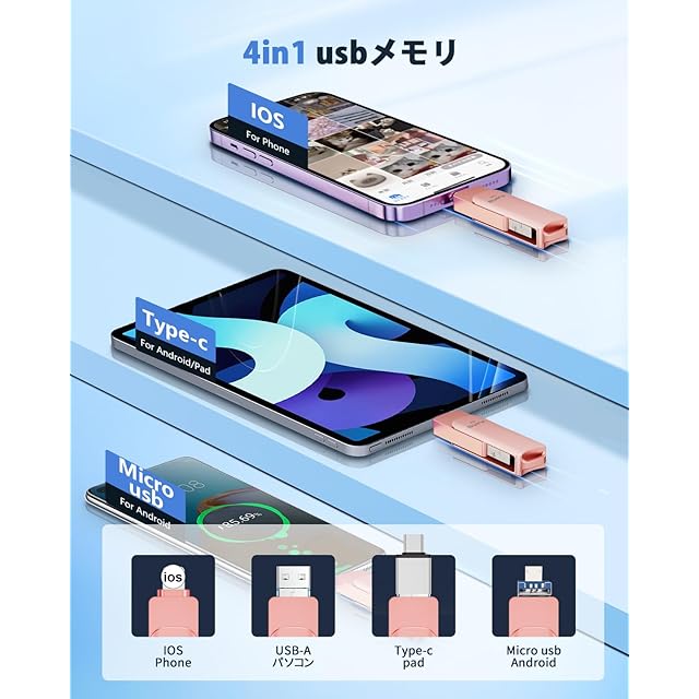 【2025新登場 アプリ不要】USBメモリ 128GB 4in1 高速 Phone usbメモリー 写真保存 回転式 iOS/Type-C/USB/Micro USB フラッシュメモリ 大容量 usb データ スマホ バックアップ Phone/Pad/PC/Macbook/Android対応 外付けメモリ 容量不足解消 ピンク Phone 16/15/14/13/12/SE/Pad Air各種対応