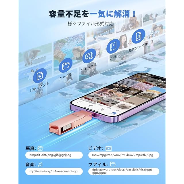 【スマホの容量不足に困って?】スマホの容量を空けたい、容量が足りない、データ整理をする時間がない。スマホ内の写真やデータの移行に便利なusbです。写真や動画だけでなく、ほとんどの形式のドキュメント・ファイル・ボイスメモ・メモ・音楽ファイルも保存できます。