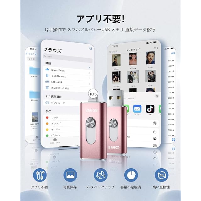 【プリ不要でPhone から直接 USB に写真・動画を移す 】 この Phone 対応 USB メモリは、専用アプリ不要でスマホのアルバムから動画・写真データを直接外付け USB メモリに保存可能!機器が苦手な方でも直結だけで簡単にデータ移行でき、Phone データ保存や外付けメモリとしての使い勝手を追求。USB3.0 規格搭載で高速アクセスを実現し、iOS/Android/Windows/Mac 対応で幅広い環境で活躍します。