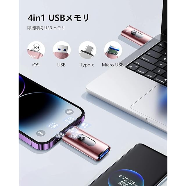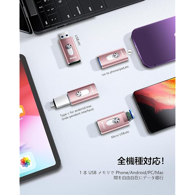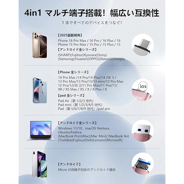 【4in1 ポート搭載|ios/Type-C/USB/Micro USB 対応の互換性抜群 USB メモリ】 ios端子・Type-C・USB-A・Micro USB の 4 つのポートを搭載し、Phone/Android/PC/Mac/pad などあらゆるデバイスと直接接続可能。1 つの USB メモリで iOS/Android/Windows/Mac OS 間でデータを共有・移行!詳細対応機種:Phone 全世代(16/15/14/13/12/11/X/8/7 シリーズ含む)、pad Pro/Air/mini/ ベーシックモデル、MacBook(Pro/Air)、Type-C スマホ / タブレットなど多数対応。