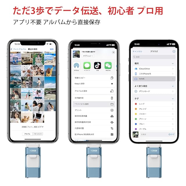 【多機種対応】 USBメモリ にはiOS、USB、type-c、micro USBの機種の接続タイプが4種も使用出来るので、PC/Android/MacBook/iOSで簡単にデータ バックアップです。 usbメモリはPhone 15 Pro Max/15 Pro/15 Plus/15/14 Pro Max/14 Pro/14 Plus/14/SE 3/13 Pro Max/13 Pro /13/13 mini /12 Pro Max/12 Pro/12 /SE 2 /11 Pro Max/11 Pro/11 /XR/XS Max/XS /X /8 Plus/8/i Pad Air(第1/2/3世代)/ MacBook(Pro/Air)/iPad mini(第1/2/3/4/5世代)/i Pad(第5/6/7/8/9世代)全シリーズ/ パソコン/ Type-Cスマホ/ Androidスマホ /タブレットなどとデータ移行 互換性のあるusbメモリ。