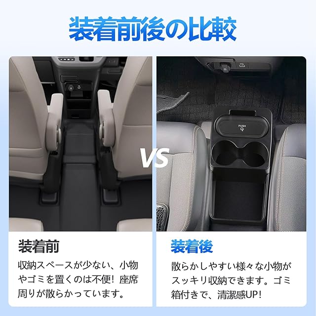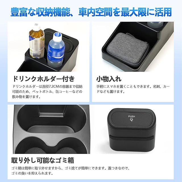 【豊富な収納機能】1、ドリンクホルダー付き、ドリンクホルダーは直径7.2CMの容器まで収納可能のため、ペットボトル、缶コーヒーなどの飲み物を置けます。2、小物入れ:手軽にスマホを置くこともできます。名刺、カードなども置けます。