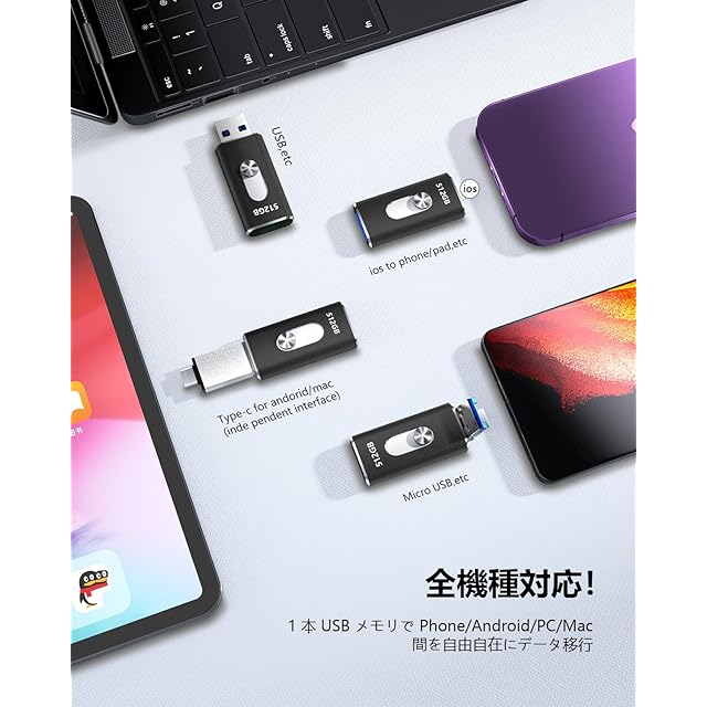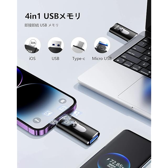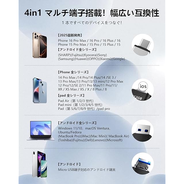 【4in1 ポート搭載|ios/Type-C/USB/Micro USB 対応の互換性抜群 USB メモリ】 ios端子・Type-C・USB-A・Micro USB の 4 つのポートを搭載し、Phone/Android/PC/Mac/pad などあらゆるデバイスと直接接続可能。1 つの USB メモリで iOS/Android/Windows/Mac OS 間でデータを共有・移行!詳細対応機種:Phone 全世代(16/15/14/13/12/11/X/8/7 シリーズ含む)、pad Pro/Air/mini/ ベーシックモデル、MacBook(Pro/Air)、Type-C スマホ / タブレットなど多数対応。