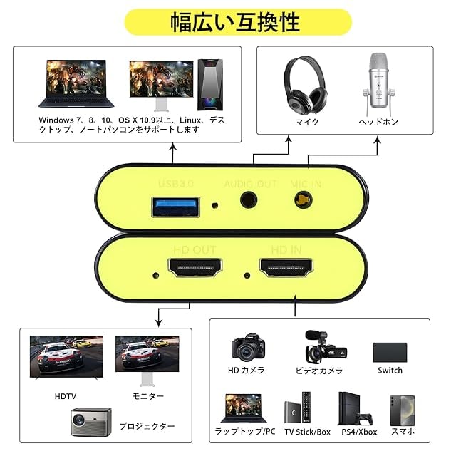 HDMI ビデオキャプチャー ボード Switch 2 対応 USB3.0 & YUY2サポート - 1080P 60FPSビデオ録画 & 4K 30Hz入力/パススルー対応 PS5/PS4/Xbox/PCなどのゲーム機対応 - OBS/Potplayer/XSplitなどの配信ソフト対応 - Mac/Windows/Linux/Android対応 - ゲーム実況/ライブ配信対応