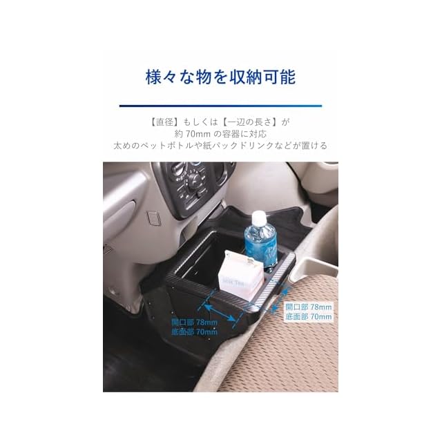【エブリイ専用設計 コンソールボックス。】 細缶から500ml紙パック飲料が入るドリンクホルダーが2か所、捨てやすい位置にあるゴミ箱を備える多機能なコンソールボックスです。 エブリイの明るい車内にマッチするベージュを採用しています。また、本革調の表面処理を採用し車内との一体感を向上させました。 ※NZ826 コンソールボックス プレミアム エブリイ用 カーボン調ブラックとの相違点は製品色と上面パネルの表面処理のみになります。機能はNZ826と同様です。