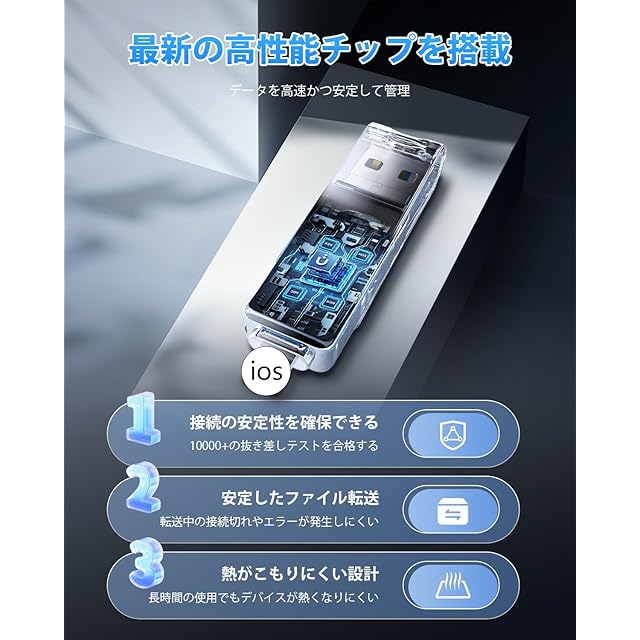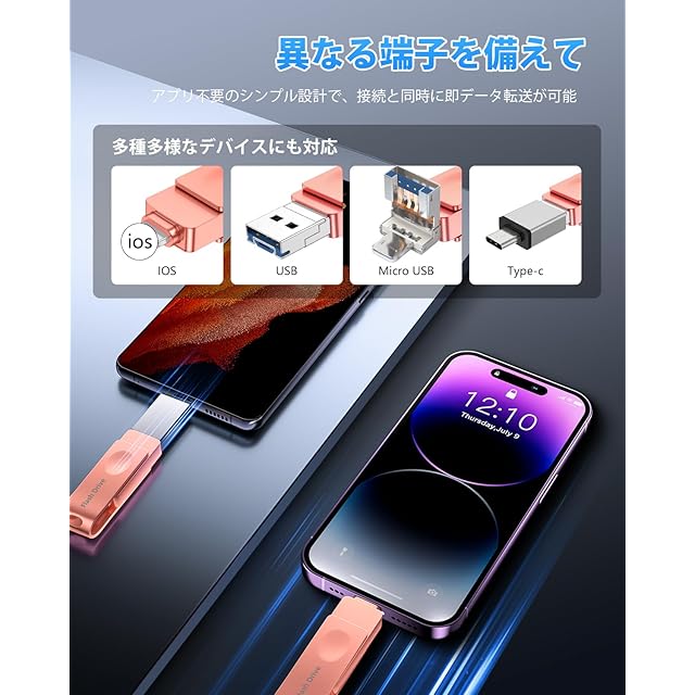 【4in1・多機能usbメモリー】USBメモリはiOS、Type-C、USB、Micro USBの四つのコネクタを搭載し、Phone、iPad、パソコンからテレビやプリンターまで、ほとんどの機種と互換性があります。アプリ不要のUSBメモリをご利用いただき、スマホの容量不足を解消できて、写真保存・データ保存の機能も果たすことができて、データ移行、データ管理、ファイル移動、データ共有やファイル圧縮などの機能も搭載されます。