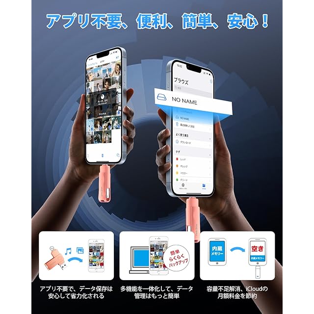【専用アプリが必要なく、データ移行簡単】まだアプリをダウンロードすることに困っていますか。今はUSBメモリをを挿入するだけで、パソコンを起動せず、専用アプリも使用せずに、スマホ内の写真や動画データなどを保存できて、電子機器が得意でない方も簡単に操作出来て、他のiPhone対応USBメモリと比べて、こちらのアプリ不要のUSBメモリは画期的です。