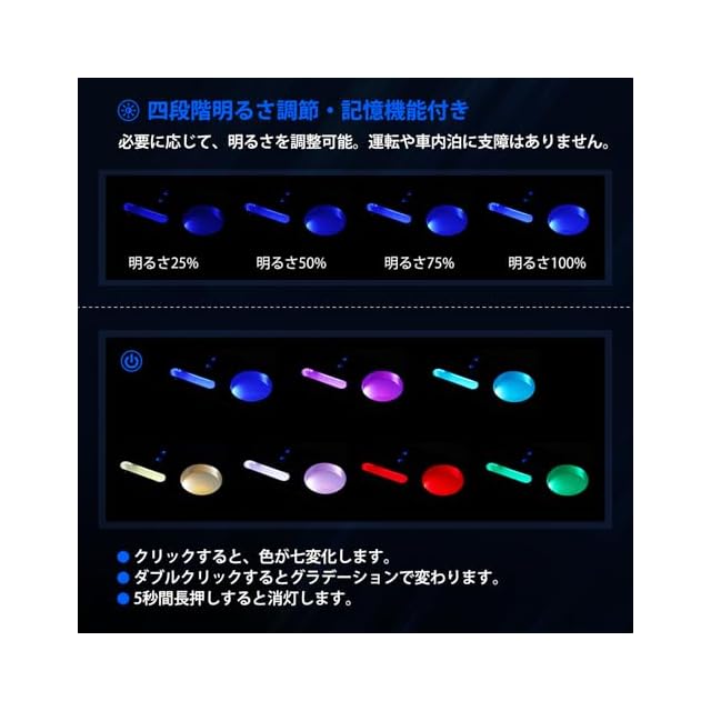 【7色調節&明るさ調節可能】(ご注意:明るさは単色点灯時に4段階で調整できます。)このハスラー コンソールボックスは七色調節可能で、お好みに調整できます。明るさも四段階調節可能です。色調節方法:クリックすると7色に変化します。ダブルクリックするとグラデーションで変化します。5秒間長押しすると消灯します。明るさ調節方法:ボタンをクリックして、100%ー75%ー50%ー25%の明るさを調節可能です。運転する時にも車中泊にも邪魔しません。記憶機能も付きます。