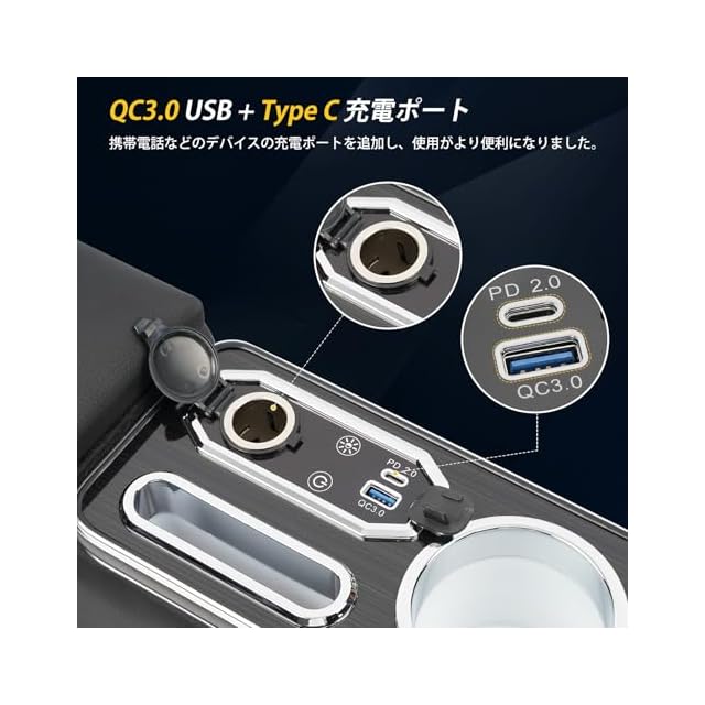 【Type-CとQC3.0 USB充電】ハスラー専用アームレストのType-Cソケットの追加とQC3.0 USBの設計で、使用がよく便利になりました。そして、シガーソケットも搭載されており、電源をオンにするとスイッチを押すだけで車内が明るくなります。