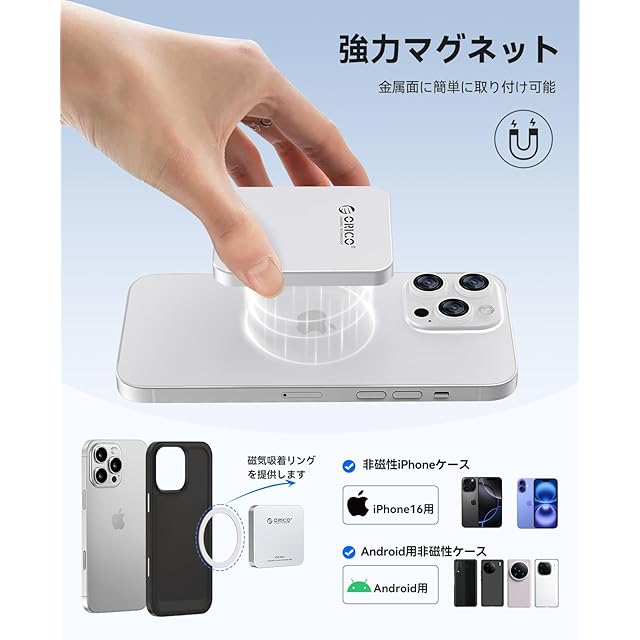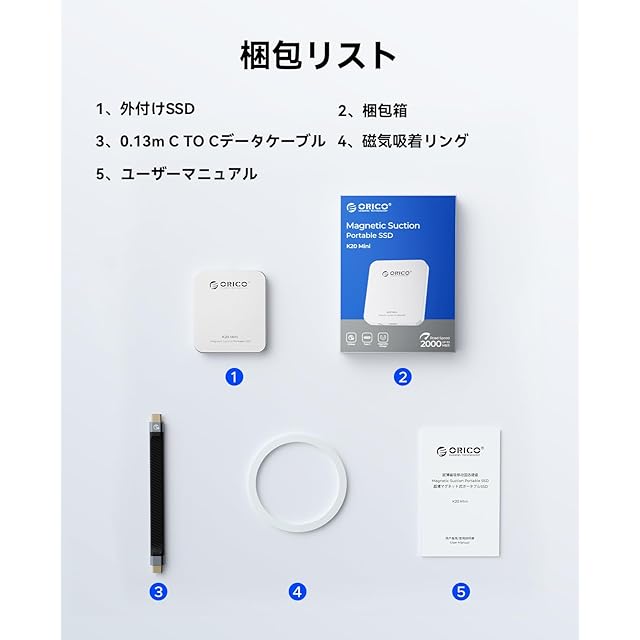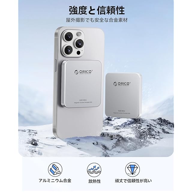 ORICO 512 GB MagSafe対応 超薄型SSD外付け アルミニウム合金 iPhone 16/15 Pro Max用4K 120Hz ProRes HDR記録・保存 マグネット式ポータブルSSD USB3.2 Gen2x2 2000MB/s高速転送 USB-Cデバイス対応 - K20MINI