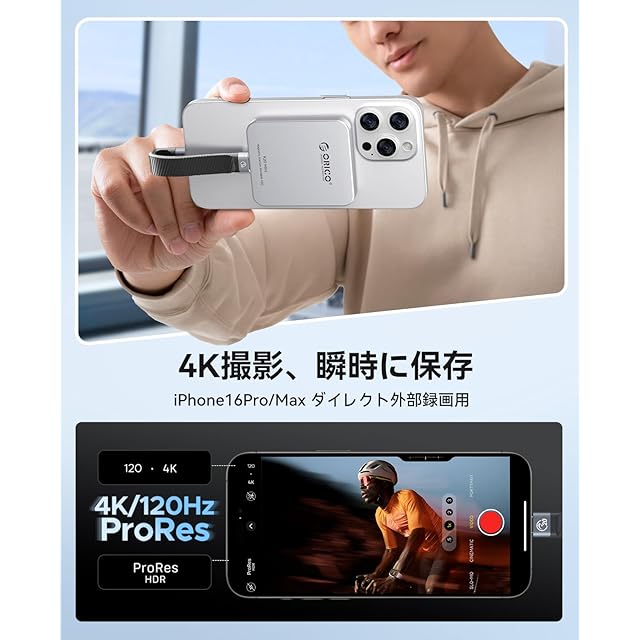 【4K 120 fps ProRes】ORICO K20MINI外付けソリッドステートドライブは、撮影しながら直接保存可能。iPhone 16 Pro/Pro MaxのProRes HDR録画データを編集不要で即保存。2度転送の手間を削減します。