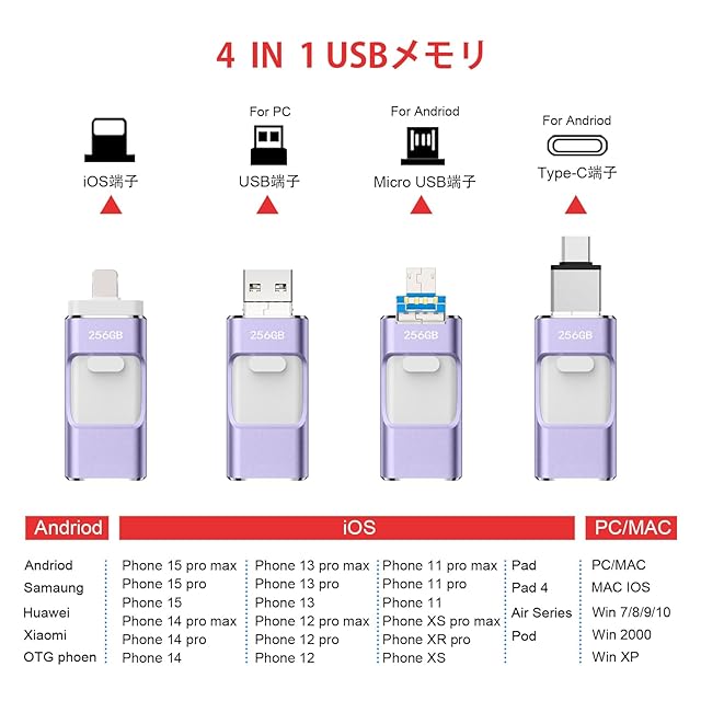 【アプリ不要・正規認証品 】256GB Phone対応usbメモリ写真保存 直接usbに写真を移す4in1 フラッシュドラメモリ人気 USB 両面挿しスマホ USB メモリー フラッシュドライブ Android パソコン対応 USBメモリ phoneの写真 を パソコン に 取り込む 容量不足解消