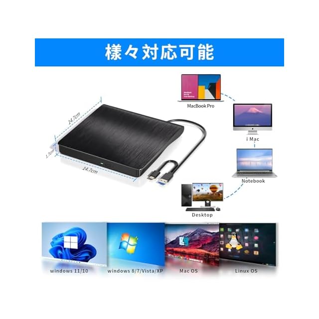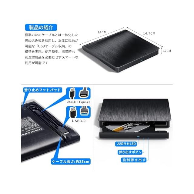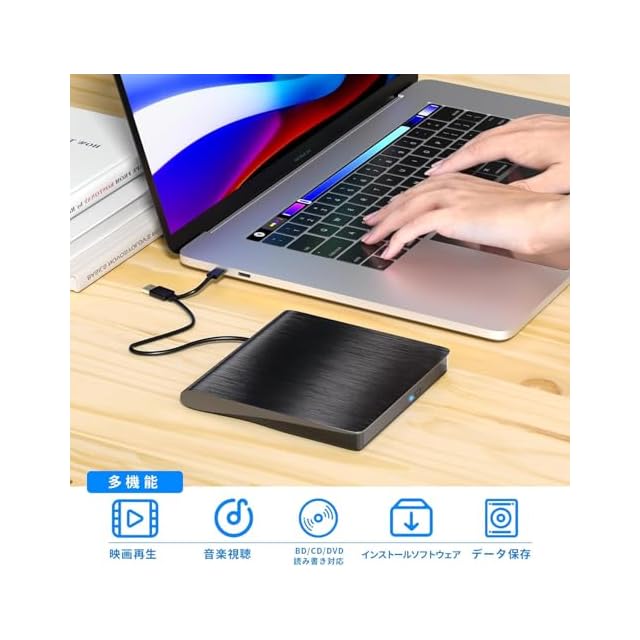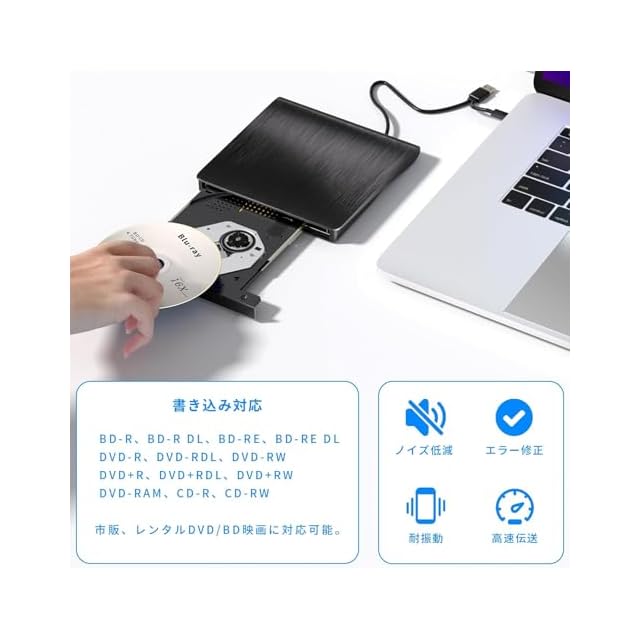弊社のブルーレイ ドライブ外付けは、最大速度 5Gbps の高度な高速 3.0 インターフェイスを採用しており、従来の 2.0 (480Mbps) より 6 倍高速です。 またType-C (USB-C)端子ので、強力なエラー修正機能、耐衝撃性、低消費電力により、データ伝送が安定をしております。 ブルーレイドライブ外付け本体も薄くし、軽くし、また内蔵ケーブルは本体に収納できるので、アタッシュケースやカバンに入れ、持ち運びやすいです。事務やオフィス場合は、最適な弊社のブルーレイドライブ外付けをおすすめです。