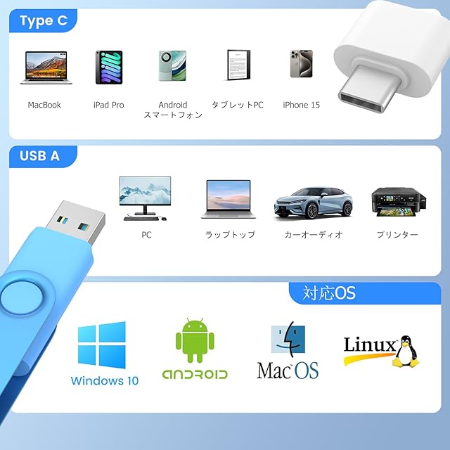 多機種対応: A+グレードチップ搭載で安定したデータ保存/転送を実現。Windows(11/10/8/7など)・Linux・Mac OS・Chrome OSはもちろん、テレビ・カーオーディオ・カセットプレイヤーまで、USB A・USB-C ポートがあればあらゆる機器で動作可能。幅広いデバイスを対応可能で、データ転送、パソコン/ Type-Cスマホ/ Androidスマホ /タブレットなどとデータ移行 互換性のあるusbメモリ容量不足、簡単に解消出来ます