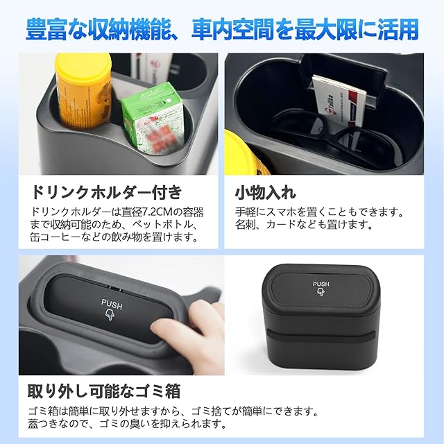 【豊富な収納機能】1、ドリンクホルダー付き、ドリンクホルダーは直径7.2CMの容器まで収納可能のため、ペットボトル、缶コーヒーなどの飲み物を置けます。2、小物入れ:手軽にスマホを置くこともできます。名刺、カードなども置けます。