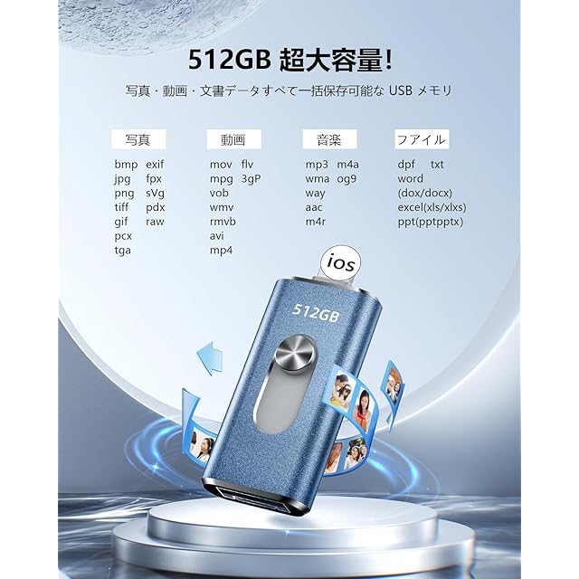 【Phone容量不足を即解決|Phone 写真保存・スマホ容量不足瞬時解消】 写真・動画・音楽・文書資料など、ほとんどのデータ形式をサポート!Phone 外付けストレージとして直接バックアップすることで、スマホや pad の容量不足をすぐに解決。日常のデータ管理はもちろん、長期間の保存にも大容量が十分な負荷をかけず、安定してご利用いただけます。