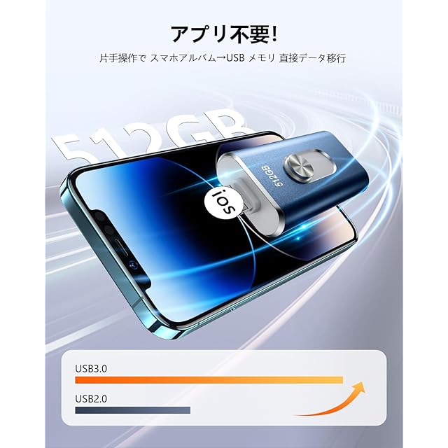 512GB usbメモリ【アプリ不要・アルバムから写真保存】4in1プッシュ型 Phone対応 スマホ携帯 高速 データ保存 バックアップ iOS/Type-C/USB/Micro USBフラッシュメモリ 外付けストレージ スライド式 容量不足解消 usbメモリ!512GB Blue