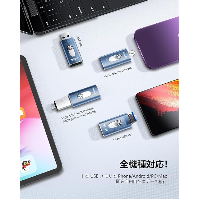 【4in1 ポート搭載|ios/Type-C/USB/Micro USB 対応の互換性抜群 USB メモリ】 ios端子・Type-C・USB-A・Micro USB の 4 つのポートを搭載し、Phone/Android/PC/Mac/pad などあらゆるデバイスと直接接続可能。1 つの USB メモリで iOS/Android/Windows/Mac OS 間でデータを共有・移行!詳細対応機種:Phone 全世代(16/15/14/13/12/11/X/8/7 シリーズ含む)、pad Pro/Air/mini/ ベーシックモデル、MacBook(Pro/Air)、Type-C スマホ / タブレットなど多数対応。