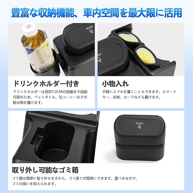 【豊富な収納機能】1、ドリンクホルダー付き、ドリンクホルダーは直径7.2CMの容器まで収納可能のため、ペットボトル、缶コーヒーなどの飲み物を置けます。2、小物入れ:手軽にスマホを置くこともできます。名刺、カードなども置けます。