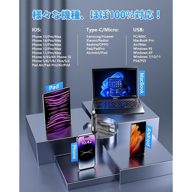 【4in1・多機能usbメモリー】USBメモリはiOS、Type-C、USB、Micro USBの四つのコネクタを搭載し、Phone、iPad、パソコンからテレビやプリンターまで、ほとんどの機種と互換性があります。アプリ不要のUSBメモリをご利用いただき、スマホの容量不足を解消できて、写真保存・データ保存の機能も果たすことができて、データ移行、データ管理、ファイル移動、データ共有やファイル圧縮などの機能も搭載されます。