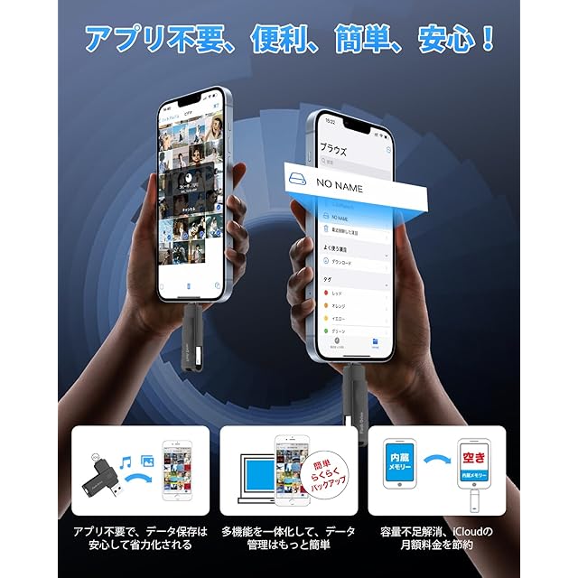 【専用アプリが必要なく、データ移行簡単】まだアプリをダウンロードすることに困っていますか。今はUSBメモリをを挿入するだけで、パソコンを起動せず、専用アプリも使用せずに、スマホ内の写真や動画データなどを保存できて、電子機器が得意でない方も簡単に操作出来て、他のiPhone対応USBメモリと比べて、こちらのアプリ不要のUSBメモリは画期的です。