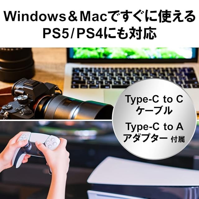 【Type-C & Type-A対応】Type-C to CのUSBケーブル(30cm)に加え、Type-C to A変換アダプターが付属。機器を選ばずに使える。