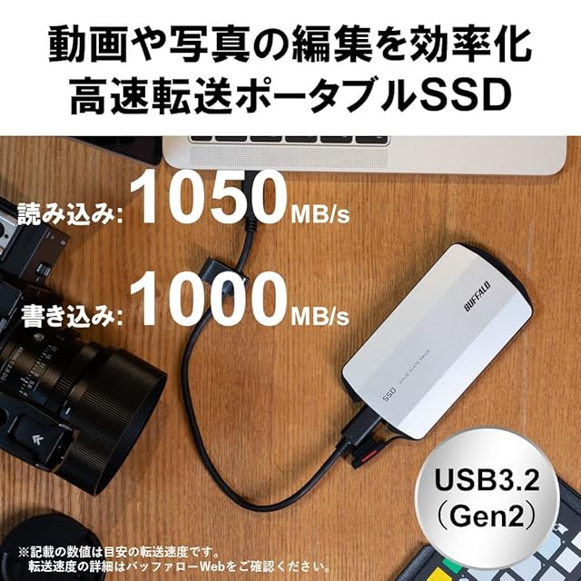 【写真や動画を高速転送】USB3.2 Gen2対応で、最大読み込み速度1,050MB/s・最大書き込み速度1,000MB/sの高速データ転送を実現。