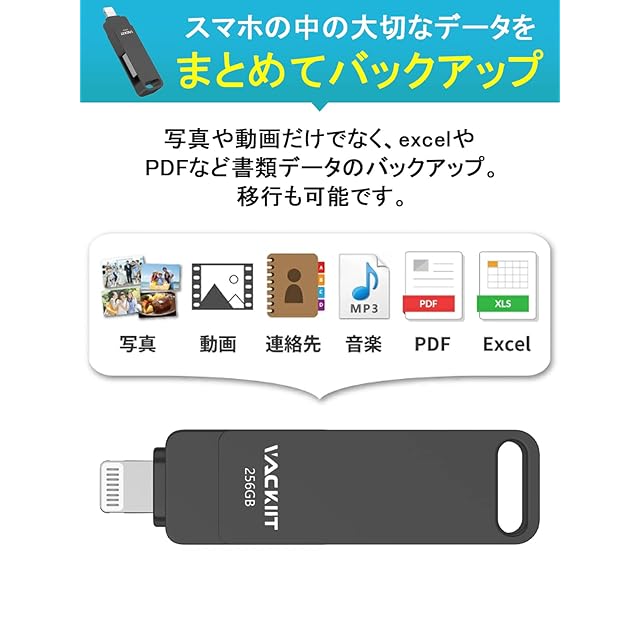 Vackiit「Apple MFi認証取得」iPhone用 usbメモリusb iphone対応 Lightning USB iPhone用 メモリー iPad用 フラッシュドライブ (ブラック, MFI 認証済み 256GB)