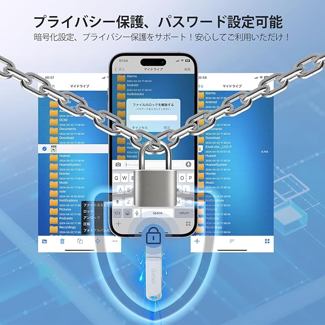 【様々な機種対応・データ暗号化】本USBメモリは、さまざまな機種に使用でき、さまざまなデバイスと接続できます。PC/Android/Phoneとのデータバックアップが簡単に行えます。usbメモリはPhone 15 Pro Max/15 Pro/15 Plus/15/Phone 14 Pro Max/14 Pro/14 Plus/14/SE 3/13 Pro Max/13 Pro /13/13 mini /12 Pro Max/12 Pro/12 /SE 2 /11 Pro Max/11 Pro/11 /XR/XS Max/XS /X /8 Plus/8/Pad Air(第1/2/3世代)/パソコン/ Type-Cスマホ/ Androidスマホ /タブレットなどとデータ移行互換性のあるusbメモリ。また、本usbメモリはパスワード保護機能が搭載されており、個人情報のプライバシーを強力に保護します。