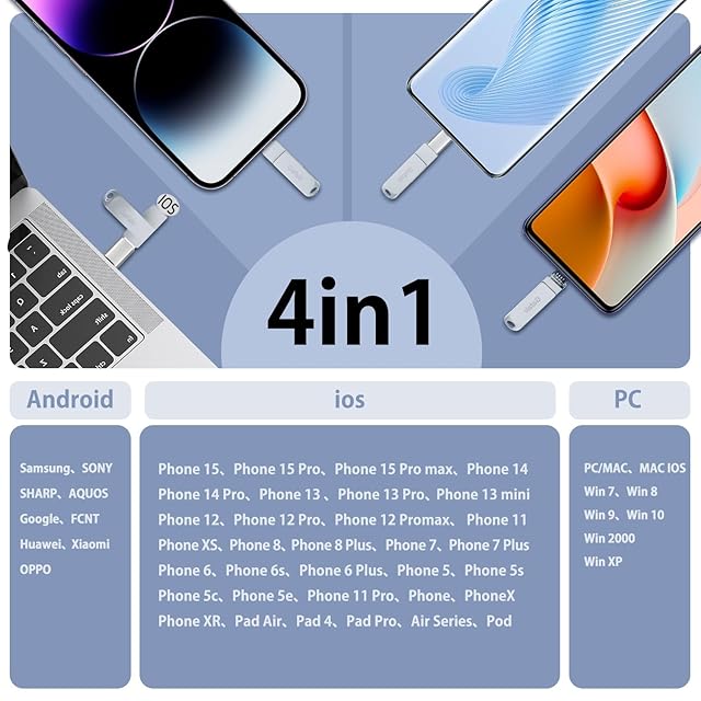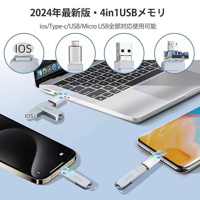 【4 in 1 USBメモリ・初心者向け】当社のUSBメモリはPhone、USB、Type-C、Micro USBの4つが一体化した、異なるデバイス間でのデータ転送が容易に行え、多機能な初心者向けのUSBメモリーです。Phone、コンピューター、Android、など幅広いデバイスに使用できます。データ転送やバックアップを簡単に行えるだけでなく、スマホやコンピューターの容量不足の問題も簡単に解消できます。