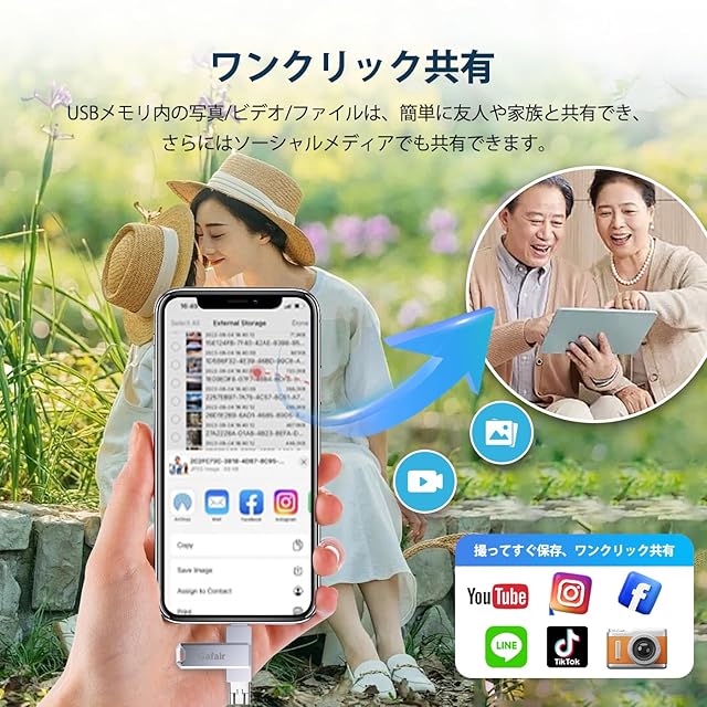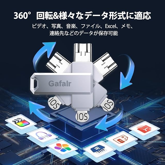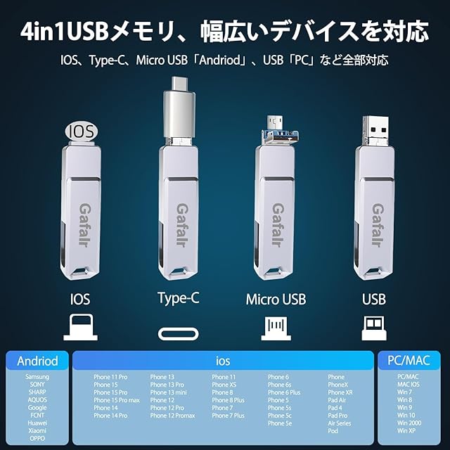 【操作は簡単&多機種対応】USBメモリは360°回転可能デザインです。簡単にPhoneの写真フォルダからデータの移行ができ、使い方は簡単、初心者でも操作は簡単のUSBメモリです。本USBメモリはiOS、Type-C、USB、Micro USBなどの4つの端子があるので、より使いやすいです。Phone USBメモリーにはPhone 15 Pro Max/15 Pro/15 Plus/15/14 Pro Max/14 Pro/14 Plus/14/SE 3/13 Pro Max/13 Pro /13/13 mini /12 Pro Max/12 Pro/12 /SE 2 /11 Pro Max/11 Pro/11 /XR/XS Max/XS /X /8 Plus/8/Pad Air(第1/2/3世代)/ MacBook(Pro/Air)/Pad mini(第1/2/3/4/5世代)/Pad(第5/6/7/8/9世代)アイフォン全シリーズ/ パソコン/ Type-Cスマホ/ Androidスマホ /タブレットなどとデータ移行 互換性のあるusbメモリです。