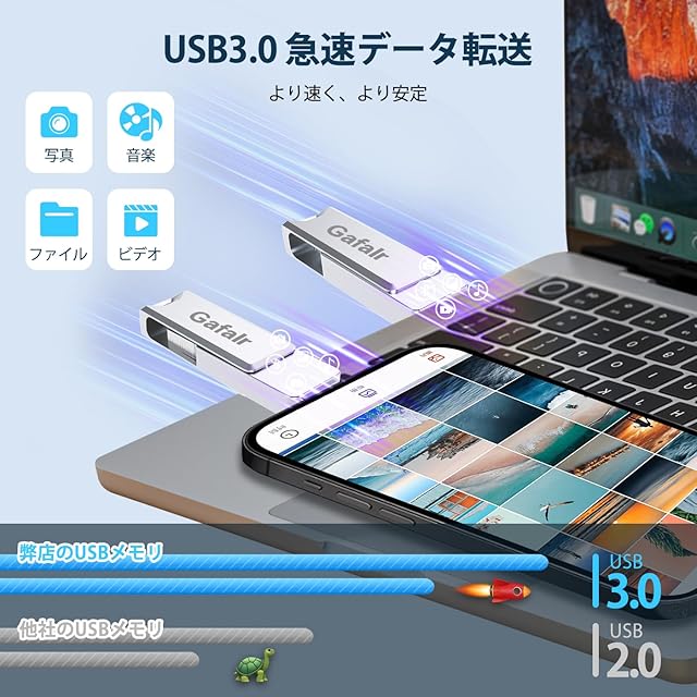 【usb3.0 高速&合金製、知能チップ】このUSBメモリーは、対応スマホ専用に開発された小型なUSBメモリーで、合金素材を使用しており、USB3.0チップを搭載しています。これにより、パソコンへの転送速度が向上し、急速なデータ移行も可能です。大量のデータをコピー&ペーストしているときも、高速な転送速度により、作業効率が大幅に向上します。