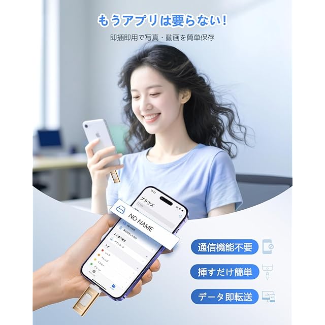 【従来品への飛躍!専用アプリ不要・多機能実現】最新技術で開発したUSBメモリでアプリなど面倒な設定は一切無し、iOS システムに付属のファイル アプリを使用して、挿せば直ぐに使用可能。写真、動画、音楽はもちろん、ExcelやPDFなどの書類データも転送可能、機器の操作が苦手な方でも簡単にデータ移動ができます。スタイリッシュなデザインに加え、便利な機能が満載のスマホ USBメモリーは、スマホと接続すると、音楽再生・写真バックアップ、ファイル圧縮・解凍、動画/画像/資料編集などの機能を果たすことができます。仕事を効率化して、日常生活をより便利にしてくれます。