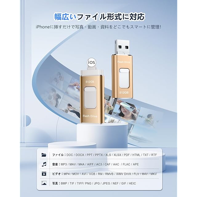 【専用アプリ不要 アルバム整理簡単】Phone用USBメモリ 4in1 USBメモリ512GB phone用外付けメモリ 高速USB3.0 タイプc usbメモリー IOS/Android/PC/Macに対応 phone兼用 バックアップ アプリ不要 スマホ usbメモリ phone 写真データ保存 スマホ容量不足解消 写真画像撮り放題(ゴールド)