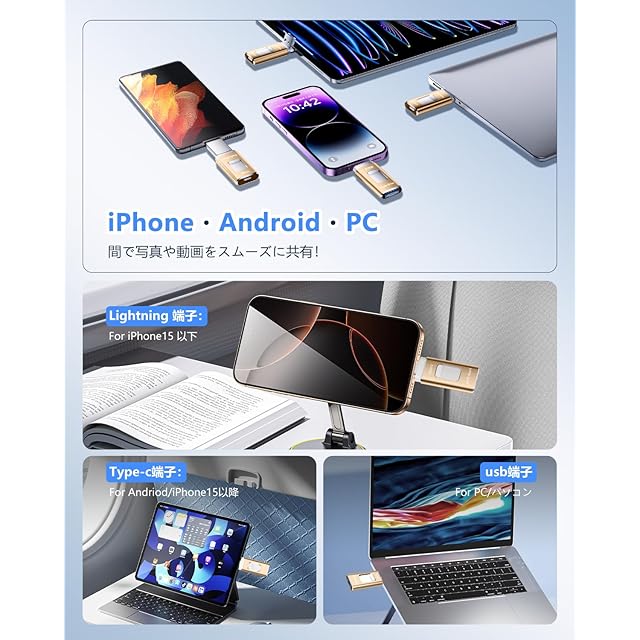 【一本四役・高速データ転送】iPhone用USBメモリはiOS、Type-C、USB、Micro USBの四つのコネクタを搭載でこの一本で全てのIOS、Windows PC、Typec、Micro USBのAndroid設備にスライドで対応しています。デバイスごとに対応した製品を複数購入する問題を解決します。各機種の間に写真やビデオなどのファイルを自由に共有できます。高品質なチップを採用しており、安定性が飛躍的に向上され、高速なデータ伝送を実現します。ネット環境がなくても気になる大量に溜まっている写真や動画データを簡単にバックアップできるので、端末の容量不足も解消できます!Phone写真バックアップにより、高額なクラウド サービスの月額料金を節約するのに役立ちます。