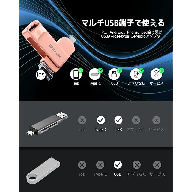 256GB【アプリ不要•Phone端子•type-c•USBA一体】 スマホ/phone用写真保存 usb phone対応 データ保存 バックアップ タイプc 外付け microアダプター 全phone/全pad/Android/PC使えるusbメモリ (ピンク, アプリ不要256GB)