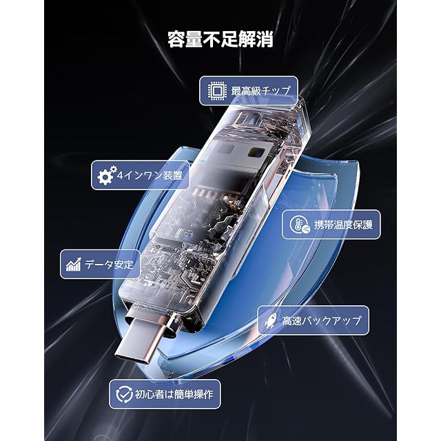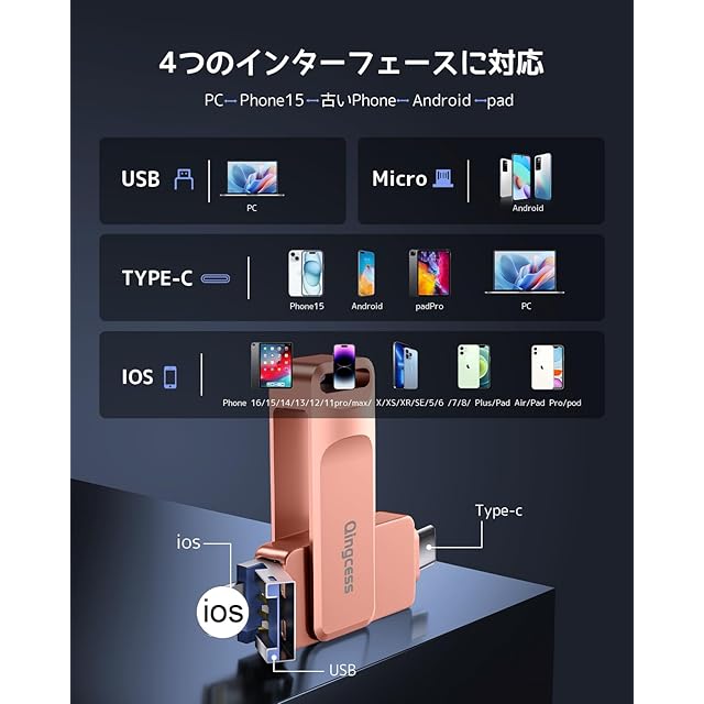 【99パーセントの機種に対応】 USBメモリ にはiOS、USB、type-c、micro USBの機種の接続タイプが4種も使用出来るので、PC/Android/MacBook/アイフォンで簡単にデータ バックアップです。ios usbメモリ-[全phone/Pad ]、 type-c-[phone15/Androidスマホ /タブレット]、USB-[Windows/ Macパソコン]、microusb[古い端末]などとデータ移行 互換性のあるusbメモリ。