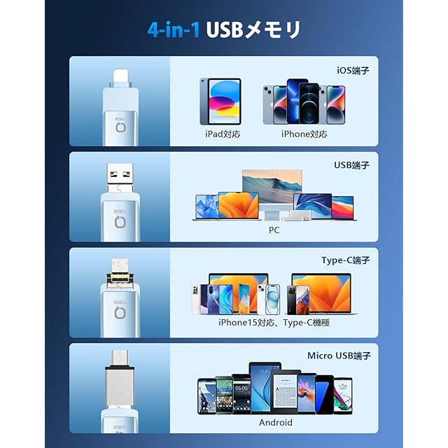 【高い互換性】本USBメモリは4つの端子があるので、ほぼすべての機種と互換性があります。iOS機種:全てのPhoneシリーズ、すべてのPadシリーズ;Android機種:Androidスマホ、Type-Cスマホ;PC:パソコン、Macbook Pro/Air、ノートパソコン(詳細は商品の説明文に書いてある対応する機種をご参考ください)。iPhone対応USBメモリは写真保存、データバックアップ、動画移行、ファイル編集や音楽再生などの機能を搭載し、iOS機種、パソコン、Android スマホの間でデータ移行は楽になります。