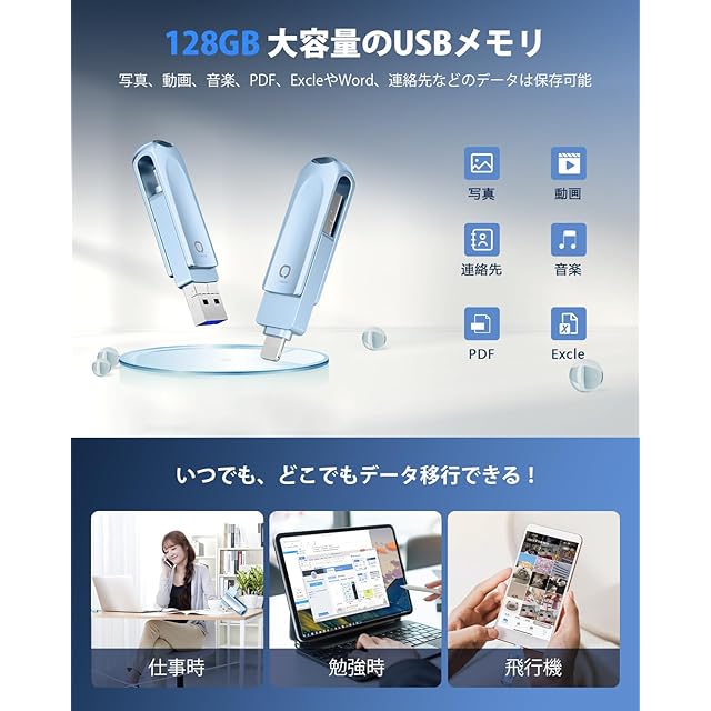 【スマホ容量不足解消・iCloud課金対策】ビッグデータの時代、スマホに保存されるデータはますます多くなり、iCloudはわずか5GBで、すぐいっぱいになり、容量が不足している問題は頻発します。今、写真、動画やファイルなどのデータはUSBメモリーにバックアップできて、iPhone対応USBメモリを使用し、容量不足の問題を簡単に解決できます。これからは、どの写真を削除するかを考える必要がなく、USBメモリを挿入し、データバックアップするだけで、スマホの空き容量を増やすことができます。iCloudにもこの以上課金する必要はなくなります。