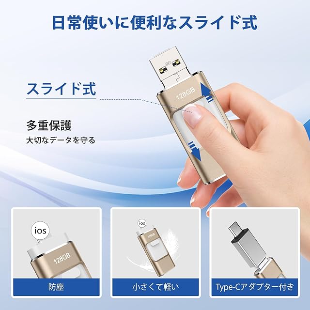 【スライド式・利便性に優れる】主にスマホ用なので、スライド式のUSBメモリーはより使いやすくて、収納もしやすいです。真ん中にスライドボタンがあり、上下にスライドしてコネクタを変更できて、様々な機種に対応しやすいです。しかも収納ケースとiOSコネクタカバーも付いており、日常使いにとても便利です。材質の方には、各性能に優れているアルミニウム合金を採用しており、耐久性は抜群で、安心してご利用いただけます。